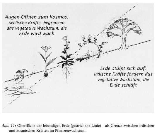 Aus den Ergebnissen der Geistesforschung beschreibt Rudolf Steiner die Erde als einen lebendigen Organismus mit Seele und Geist. Auf diesem Hintergrund kann das Blühen der Pflanzen als eine seelische Wirkung verstanden werden, mit Kräften, die von aussen in das Pflanzenwachstum hereinwirken. Die Pflanzen bilden die sichtbare Hülle dieser lebendigen Erde und bilden gleichzeitig eine Art Grenze zur seelischen Umgebung, indem das rein vegetative Wachstum durch die Blüteninduktion zum Abschluss kommt. Dadurch wird die Oberfläche des lebendigen Erdorganismus markiert. Als übergeordnete Metamorphose im Pflanzenreich lässt sich darstellen, wie die Pflanzengestalt davon abhängt, auf welchem Niveau die Kräfte aus dem Seelenraum der Erde mit den aufbauenden Lebenskräften der Erde ins Gleichgewicht kommen. So wie beim Menschen der Abbau des Leibes durch die seelische Aktivität am Tage in der Nacht wieder regeneriert werden muss, kann auch beim Erdorganismus von Schlafen und Wachen gesprochen werden, einerseits im Jahresrhythmus, andererseits aber auch im unterschiedlichen Wuchs der Pflanzen.